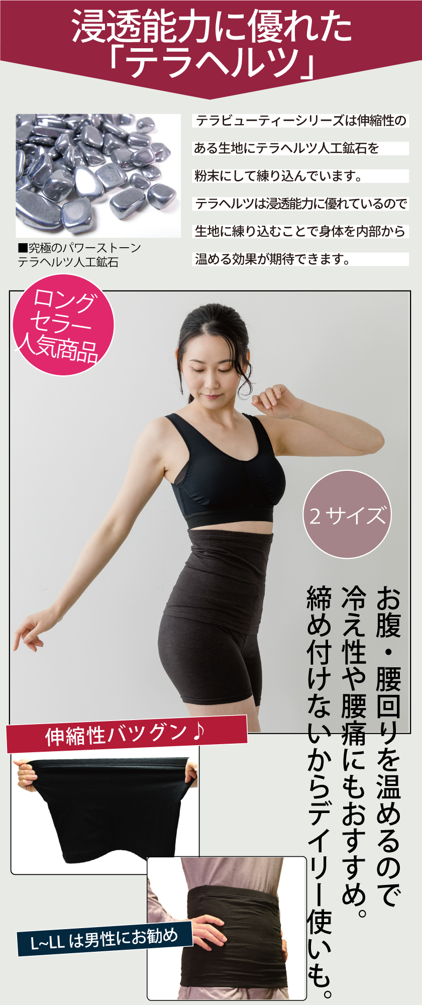 テラビューティーシリーズはテラヘルツ鉱石を配合して仕立てた生地を使用しています。 「ベリーバンド」は発売以来、全てのテラビューティーシリーズの中でもナンバー1人気を誇っています。2サイズあり、肌触りがよく伸縮性もいいのでストレスも軽減されます。ソフトでしなやかな着心地なので腹巻きやコルセット感覚でご着用していただけます。リカバリーウェアとしてもオススメいたします。L-LLサイズは男性におすすめです。ご使用いただいたお客様からは、腰痛やお腹の冷えが改善されたというお声以外にも便通が良くなったとのお声も多数頂いております!! ※商品の効能、効果に関しましては、個人差がございます。全ての方に効能、効果があるわけではございませんのでご了承ください。